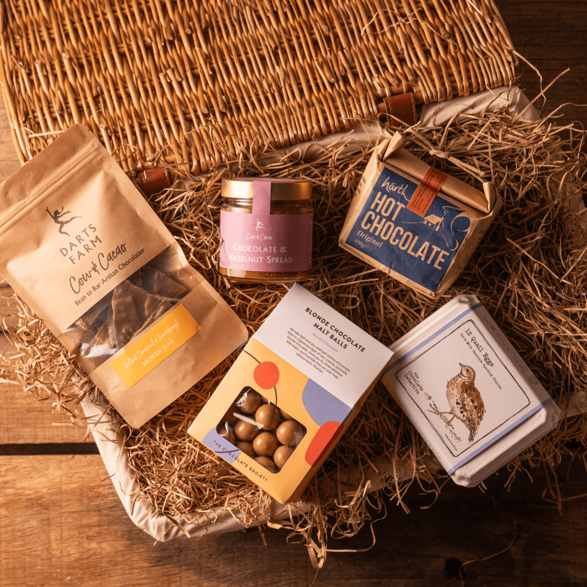 An irresistible selection of unique, handcrafted artisan chocolate delights. From our smooth Salted Caramel and Sourdough Broken Slab crafted here on the farm, 12 luxury Chocolate Quail eggs filled with hazelnut praline & more.