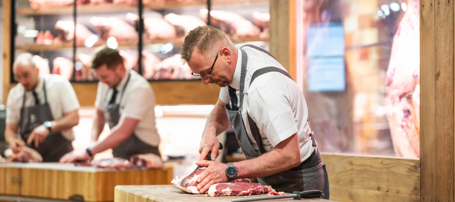 At Darts Farm our Master Butchers hand select the finest quality, locally reared British beef including our own Native Ruby Red Devon cattle. Slow reared on a natural diet, spending the summer months grazing our wetlands, they develop deep, complex marbling producing beef with amazing flavour and texture.